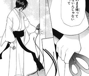 Rin's absence goes all but unnoticed until Kureno stumbles across her in the room by coincidence. Until then, however, Akito torments Rin. She brutally cuts chunks of Rin's hair off, strips her of her clothing in exchange for a plain yukata and threatens her that if she tries to leave, she'll hurt Hatsuharu. Akito knows exactly what Rin's weakness is and Rin eventually loses all will to live. She stops eating altogether and the only thing that keeps her going is a very infrequent dream of being with Haru in happier times.