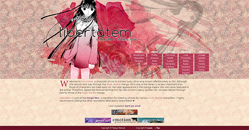 About LibertatemA bit of history about this site.It was over ten years ago that I first learned about Rin. I was an avid fan of the Fruits Basket anime and manga and eagerly read fan-translations of new chapters whenever they were released. Rin was a character that instantly intreagued me; she never made an appearance in the anime and so little was known about her for so long. The more I learned about the motives behind her actions, the more I grew to like her.At the time, I already had a fan site to Kyo (Baroque Orange) and it was not long before I went on hiatus from making any more fan sites. I remember wanting to make a site dedicated to Rin but with work and other social commitments, I never got around to it. Even my Kyo site was left incomplete. After having gotten back into making sites as a hobby again, one of my ambitions was to remake all of my old sites to bring them up to today's standards. Left incomplete with outdated information, Baroque Orange was at the top of my to-do list. While I worked on updating it, I felt inspired to plan out the site for Rin that I'd always wanted to create. Thus, Libertatem was born and fully complete as of April 20, 2016! It would be the first brand new site I had created in over ten years. I chose the title as it's the latin word for freedom. Rin spends most of her time throughout Fruits Basket looking for a way to free herself and others from their curse. She also seems to hate being confined to hospitals; I feel like her desire to be free is very reflective of her role as the horse.